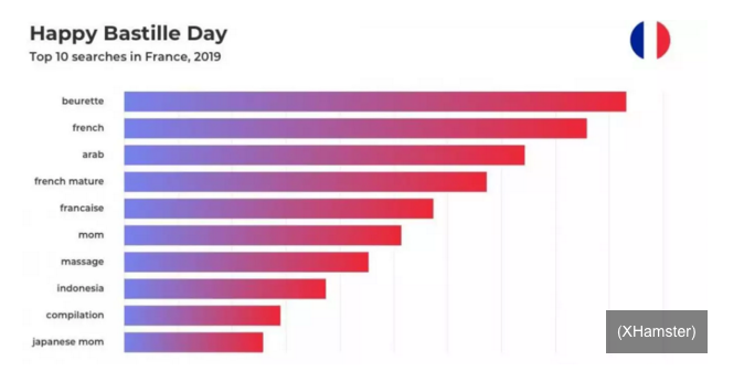 Il y a bien des manières d’interpréter une statistique. Par exemple la révélation gracieusement offerte à ses usagers français par l’un des plus importants « tubes » pornos, Xhamster, à l’occasion du 14 juillet. Le site a classé les recherches de ses usagers hexagonaux par ordre de fréquence :