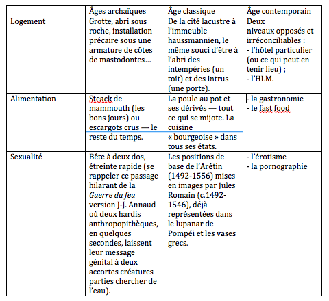 J’expliquai donc à ces jeunes gens (tous des mâles, qui salivaient d’avance) que l’humanité pouvait être organisée en trois âges, Archaïque / Classique / Contemporain, et distinguée selon trois critères, le Logement / l’Alimentation / la Sexualité. Et je dessinai donc le tableau suivant :