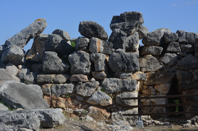 Ruiné ! Les murs cyclopéens du palais mycénien se sont effondrés. Restent quelques blocs erratiques, illisbles, maintenus dans un équilibre précaire.