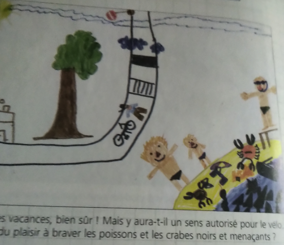 C’est important, pour un enfant, de s’exprimer par le dessin — d’autant plus important qu’il n’a pas exactement les mots, et que si on ne les reprend pas en classe, ils les auront de moins en moins. C’est important pour lui d’exprimer, en un geste global, ce qu’il a envie de dire sans avoir les mots pour le dire. C’est pour lui une fierté particulière que son dessin soit affiché sur les murs de la classe, admiré de ses condisciples et de ses enseignants. Eventuellement interprété — chacun sait ce que signifie un joli soleil dans un coin du dessin — encore qu’il arrive qu’il y ait des crabes sur la plage des vacances…